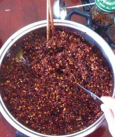 炸辣椒酱。油烧热然后先下生姜末用勺子多搅动,然后蒜末然后辣椒面,加盐少许味精糖就OK