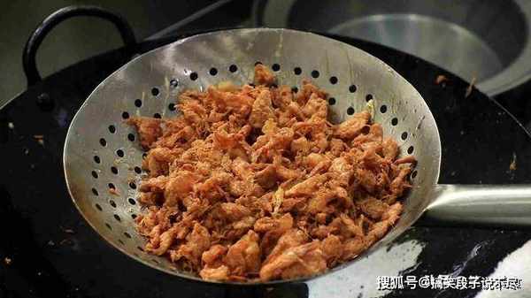 2.食材全部准备好以后,我们开始烹饪,锅内烧油,油温升至6成热,油面冒青烟时,把蛋液倒入漏勺中,淋入锅内,不停的搅动,让蛋液均匀受热,保持小火炸5分钟左右,鸡蛋穗儿炸干、炸成焦红色时倒出控油。