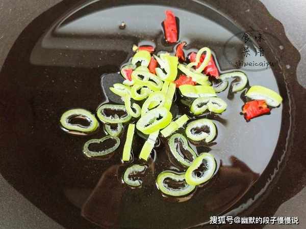 5、锅内留少许底油,放入葱花、干辣椒,炒出香味,干辣椒只放了一个,稍微有点辣味,不喜欢的可以不放,这道菜不建议重辣,有点辣味,意思意思就行。