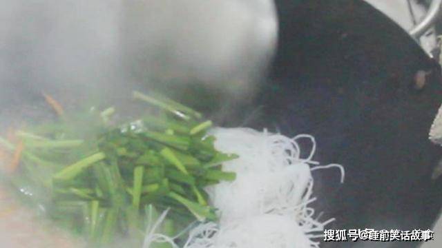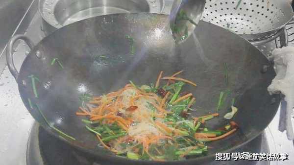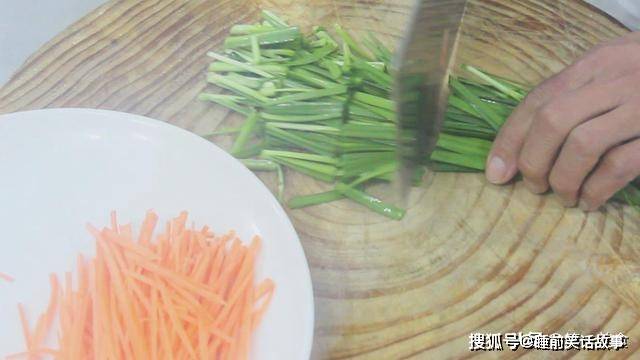 锅内加水,水烧开以后,先放胡萝卜。焯水20秒后,再放入韭菜和粉丝。翻一下,立即倒出。然后用凉水冲洗,以免粉丝坨在一起。
