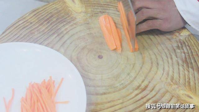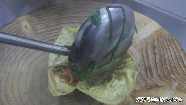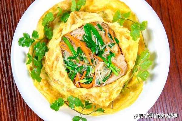 鸡蛋皮包什锦,这是一道细致菜。本菜味多而形好,做起来也不算难。想吃素的,清淡的,都可以做。以大大的鸡蛋片,覆盖胡萝卜丝,韭菜条,粉丝等物,可谓馥气内华,望之垂涎。