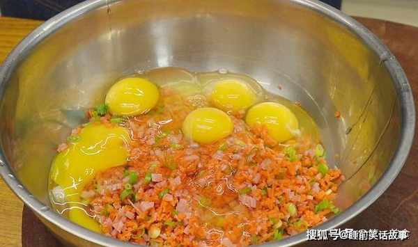 切好以后通通放在同一个盆中 ,打几个鸡蛋。调一下味: