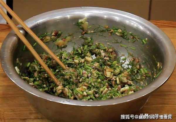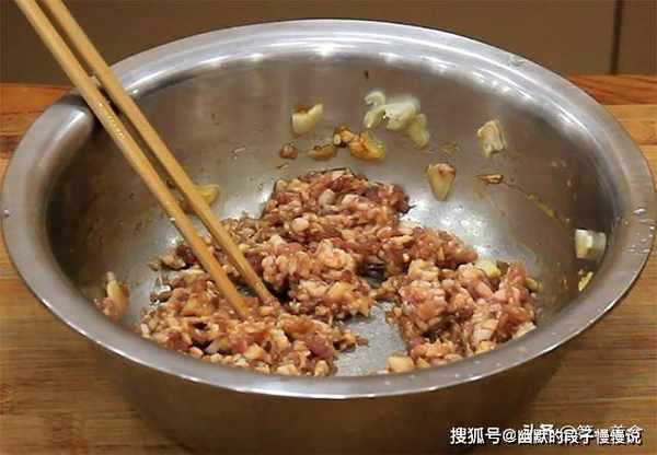 准备一小把茴香,清洗干净后切碎,放入肉馅里面,搅拌均匀,淋入香油10克继续拌匀,香油能够锁住馅料中的水分,口感更加鲜嫩。