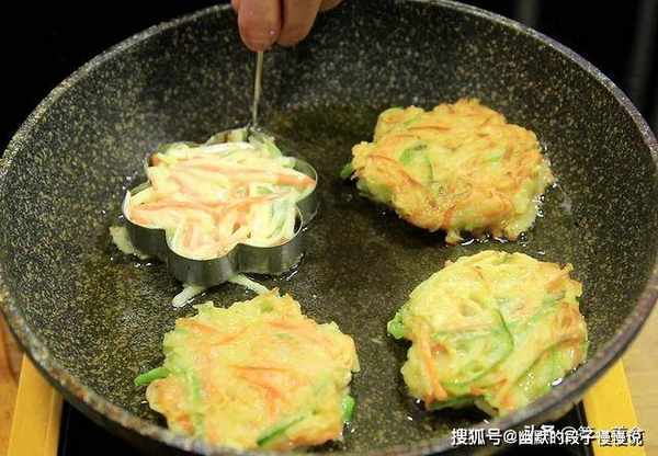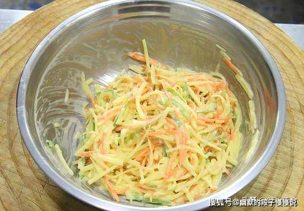 盆中加入一勺食盐和白糖提鲜,两勺鸡精,少许胡椒粉,抓拌一下,让调料均匀裹在土豆丝和胡萝卜丝上面,淋入适量的香油抓匀,以免烙制的时候食材大量出水,打入一个鸡蛋使劲地抓揉一会儿,把土豆和胡萝卜丝抓软、抓出水分,再放入一勺淀粉和150克左右的小麦面粉,把食材搅成一个粘稠的菜团即可。