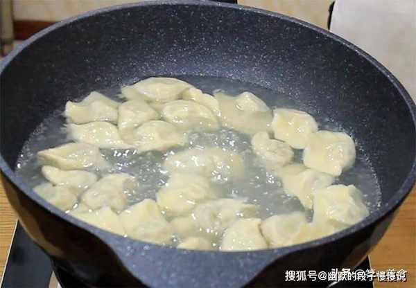 锅内烧水,水烧开以后下入饺子,用勺子轻轻推动防止粘锅,盖上锅盖煮2分钟,水沸腾以后打开锅盖,淋入少许清水,水烧开以后再次淋入清水,重复操作三次,这称为“点三水”,这样煮出来的饺子口感更加劲道,不易破皮。