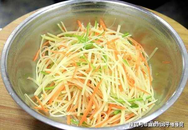 准备土豆两个,把外皮削干净,先切成薄片,再切成细丝放入盆中。