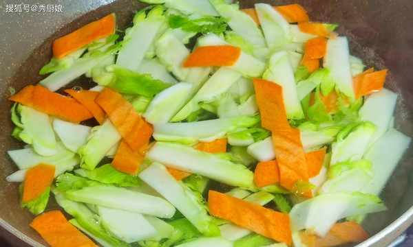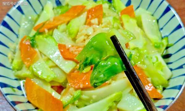 4.将儿菜和胡萝卜片放入锅中,加入适量的盐和生抽,翻炒30秒后,关火,加入少许鸡精,再次翻炒均匀后,装入盘中,即可食用。