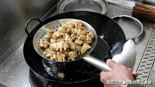 当油温升至五成热时,起锅或者开小火,把鸡块依次下入锅中,轻轻晃动炒锅防止鸡块粘在锅底,用勺子把粘在一起的鸡块打散,保持开小火把鸡块炸透、炸制表面金黄即可捞出控油备用。