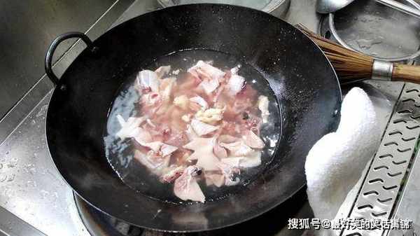 锅内烧水,冷水倒入鸡块,加入料酒5克去腥味,开大火煮出鸡块中的血水和杂质,用勺子打去锅边的浮沫,焯水一分钟以后倒出,用清水冲洗干净。