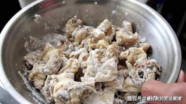锅内加入适量的植物油,在腌好的鸡块上裹上一层干淀粉,干淀粉能够锁住鸡块中的水分增强鸡肉的鲜嫩感。