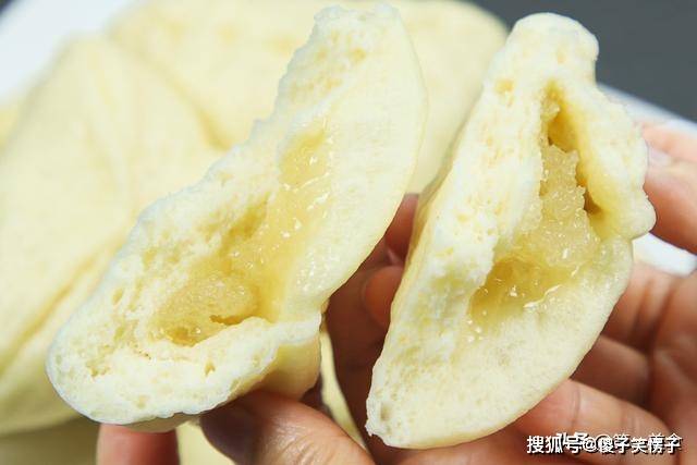 取出包子,拿在手里捏一下,糖包子能快速的回弹,蒸出来的糖包子非常松软有弹力,我们再把糖包子掰开看一下,糖还不会往外流。