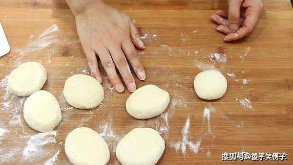 3.一个小时以后,在案板上撒一点面粉取出面团,先揉一会把面团揉光滑,把小孔搓实然后搓成条,稍微粗一点切成一个一个等分的小剂子,用手揉成圆面坯。