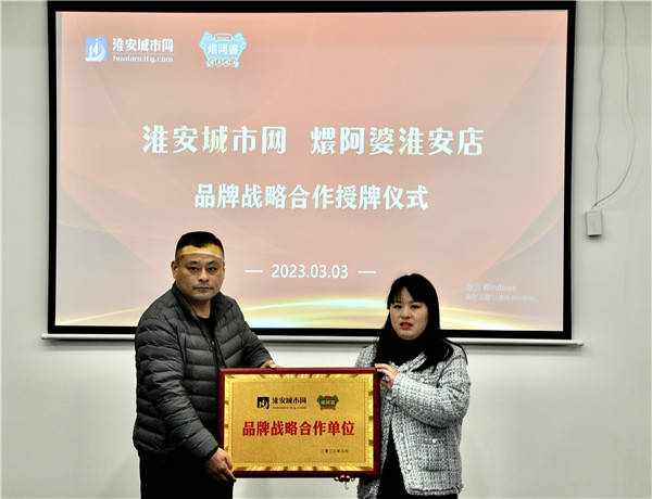 图:《淮安城市网》向煨阿婆授予品牌战略合作单位牌匾
