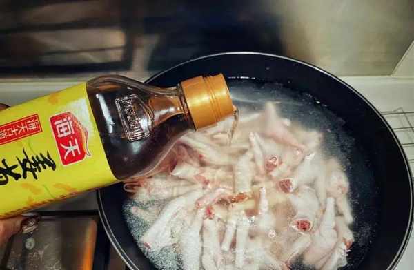 倒入适量料酒,起到去腥提鲜的作用,盖上盖子,煮10分钟左右,就差不多了。用筷子能轻松扎透就行,不要煮的时间太长,不然吃的时候没什么嚼头,就不劲道了。用凉水把鸡爪的油脂冲洗掉,可多冲洗几遍,这样泡完后吃起来清脆爽口。