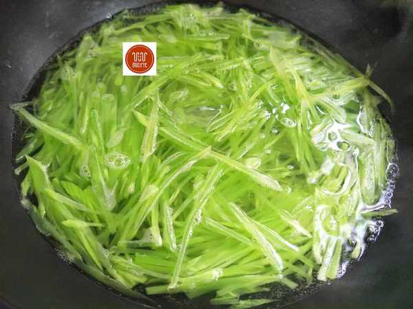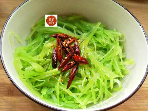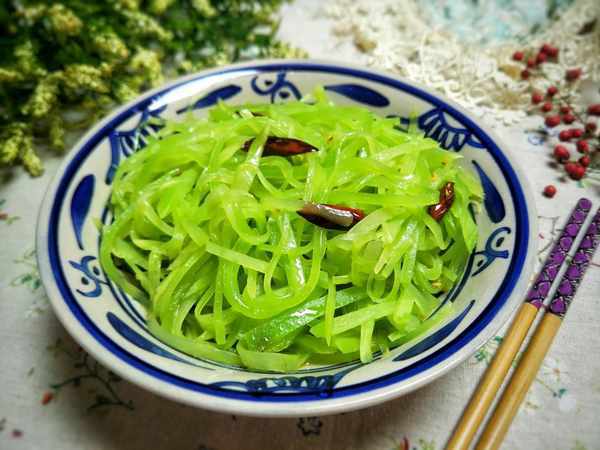 做法:1、将莴笋去皮洗净,切成粗细均匀的丝,锅中烧水,加一小勺盐,水开后放入切好的莴笋丝,焯水15到20秒。