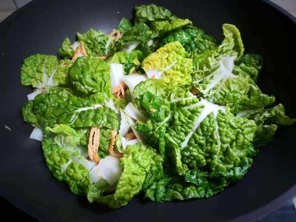 3、泡软的豆腐条捞出,加入锅中翻炒片刻,卷心菜切掉根部,一片片摘下来,用盐水浸泡一会,清洗干净切成段,卷心菜菜叶有褶皱,一定要认真洗净。倒入准备好的卷心菜翻炒,翻炒至卷心菜发蔫,加少许盐,适量生抽,大火快速翻炒均匀即可。