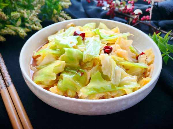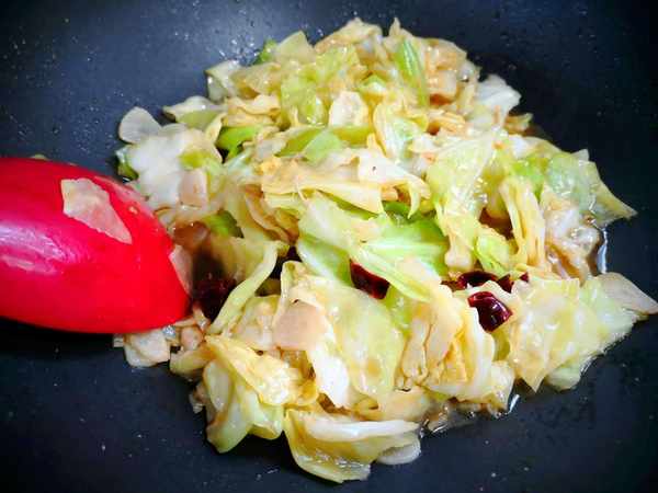 3、放入包菜,大火快速煸炒,将包菜炒至翻炒至包菜透明变软,加入鸡粉食盐各小半勺,再加1汤勺生抽,提一下鲜味,香醋少许,翻炒包菜断生即可出锅。