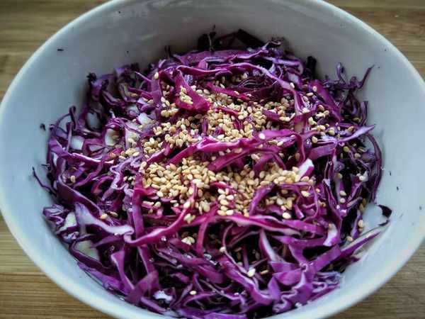 食材:紫甘蓝半个、盐、白醋、白糖、熟芝麻少量。