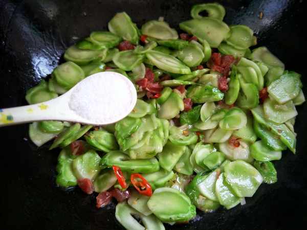 食材:儿菜1盘、腊肠1根、小红椒2根、蒜4粒、加盐、蚝油适量。