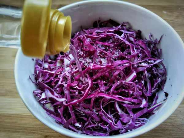 1、紫甘蓝去掉外面的不好的皮,切成细丝,放入清水中加点盐,浸泡十分钟左右,泡好后,沥干水,装碗加入少许盐,腌制十分钟,倒掉多余的水分,加入白醋。