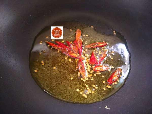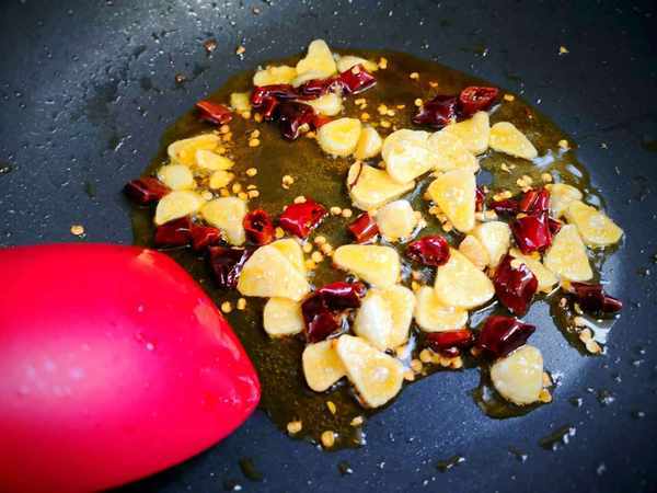 2、干辣椒切小段,蒜粒切片,锅内油热之后放花椒煸香,孩子吃菜不喜欢吃到花椒粒,我就捞出了,然后再放入辣椒段和蒜片煸炒出香味。