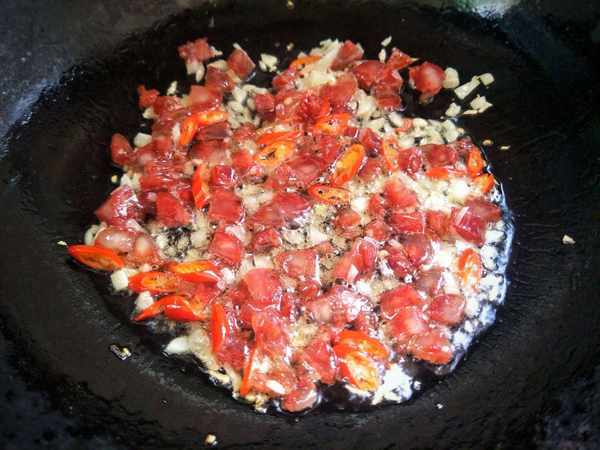2、腊肠切成小丁,小红椒,蒜粒切碎,热锅冷油,加入蒜末,红椒碎炒出香味,加入腊肠炒至透明出油。