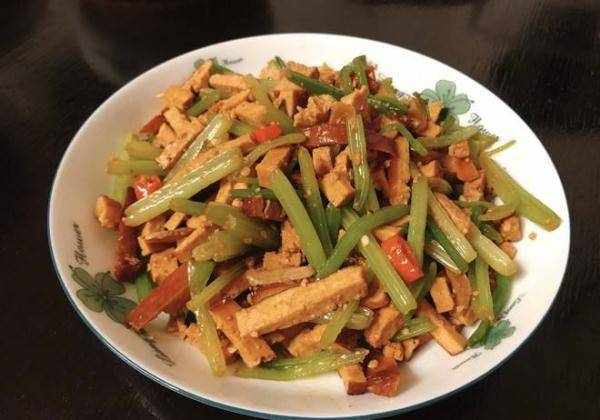 起锅烧油加入蒜末爆香,随后将切好熏干倒入锅中翻炒至表面微微发黄,香干不能炒的时间过长,否则会变硬影响口感。然后将芹菜段倒入锅中大火翻炒,当芹菜断生以后,将香菇和胡萝卜丝倒入锅中翻炒,继续大火翻炒至断生,翻炒的过程中可以根据自己的口味加入一点水,这样芹菜和胡萝卜会更软,熏干也不会太硬。如果喜欢爽脆的口感,就不需要加水了。随后加入适量的生抽,盐,白糖和鸡精调味,翻炒均匀后,清爽营养的芹菜香菇炒熏干就制作完成了。芹菜香菇炒熏干中也可以加入适量的五花肉,炒出来的菜品香味更浓。