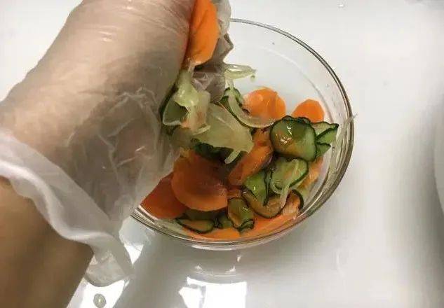 3、将黄瓜、胡萝卜、洋葱放入一个容器中,加入适量的盐,腌制15分钟,然后用手挤干水分备用。
