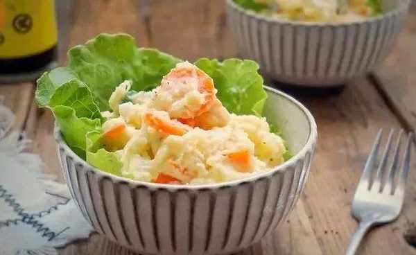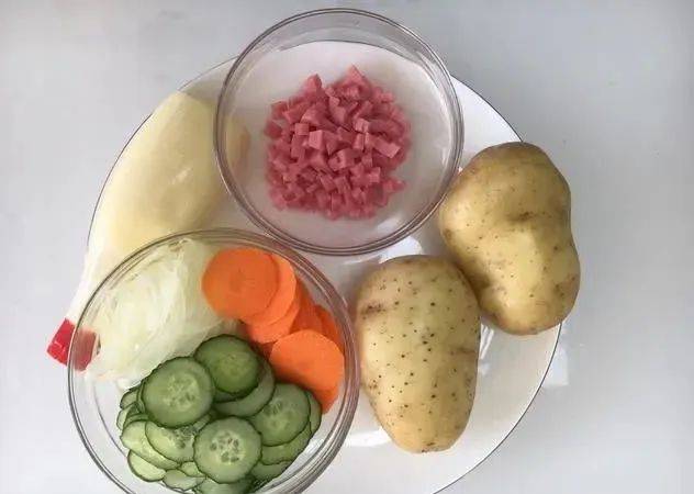 食材:土豆500克、黄瓜30克、洋葱30克、胡萝卜20克、沙拉酱适量、火腿适量。