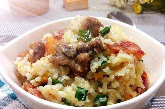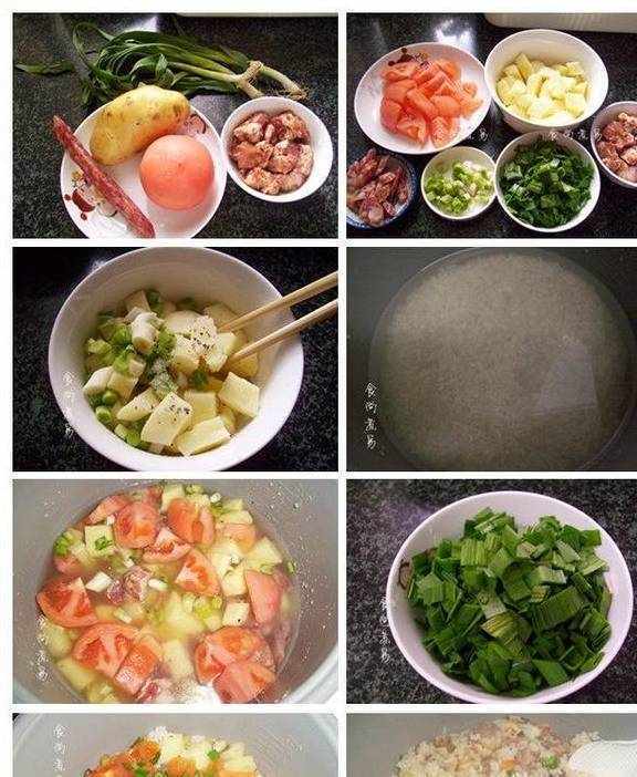食材】大米1杯、番茄1个、排骨100克、腊肠1根、土豆1个、蒜苗2根、油适量、盐适量、酱油少许、排骨酱少许、鸡粉少许、淀粉少许、黑胡椒粒少许