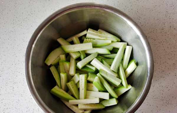 第一步:这一步就是炒茄子前多加的关键步骤,腌茄子。将茄子去蒂,清洗干净,切成小手指粗的条形。将茄子放入盆中,撒上一勺盐,用手抓匀。