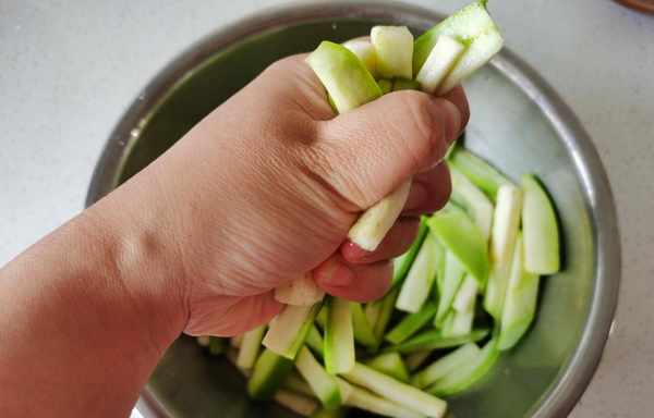 第四步:腌好的茄子已经变软了,用清水冲洗一下茄子,以免茄子太咸。然后用手挤出茄子的水分。挤得越干净,茄子就越不吃油,但是口感会变差,所以挤的时候不要太过用力,还是要留一些水分。