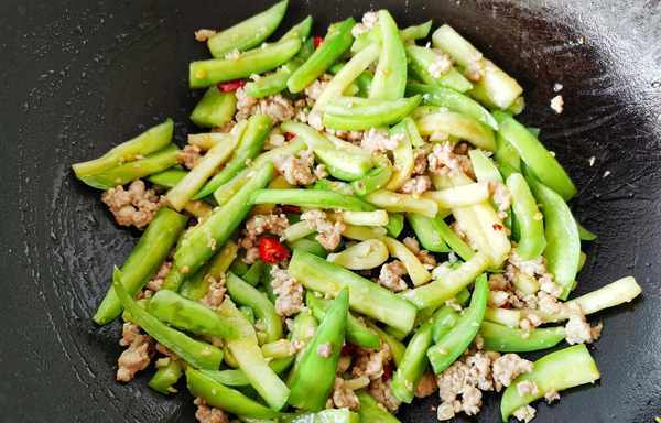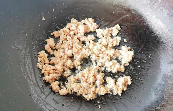 第五步:起锅烧油,放少量的油就可以,先将肉末倒入锅中滑炒一下,炒至肉末变白。