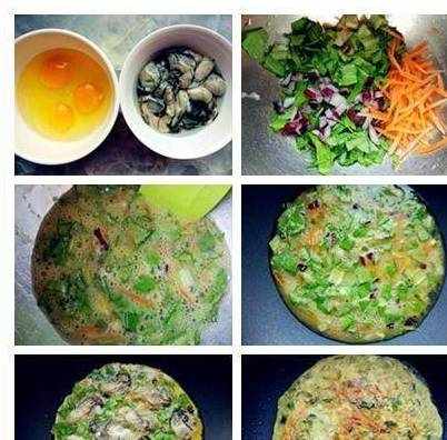 做法:1.同样将海蛎子用少量流动的清水冲净杂质,沥净水分备用。鸡蛋加盐打散。盐量要比平时做鸡蛋饼时少放一些,因为海蛎子本身有咸度。2.油麦菜切碎,洋葱切丁,胡萝卜擦丝,一起倒入盆中。3.加蛋液、白胡椒粉拌匀。4.小火烧热平底不粘锅,锅中倒少许油,将混合好的蛋液倒入。晃一下锅子,让蛋液在锅中摊匀。5.小火煎,至底部五六成熟,表面尚未完全凝固时,将沥净水分的牡蛎逐个摆在上面。6.小火煎至八分熟,小心地翻面,再煎十几秒即可。