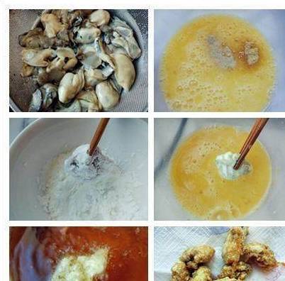 做法:把海蛎子肉放在筛网中,用流动的水冲洗干净,沥净水分备用(虽然我们当地说不洗的海蛎子才最鲜,但是为免汤汁中有碎的蛎壳和杂质,还是冲洗一下放心)。然后将鸡蛋打散,加少许姜粉和白胡椒粉搅匀(加姜粉和白胡椒粉,一是去腥,二是可以温热散寒)。将牡蛎用筷子夹住,在淀粉中滚一圈,抖掉多余的淀粉,再在蛋液中滚一下。这时锅里的植物油烧至六成热左右,大约160度-180度,将牡蛎放入炸十秒左右,时间根据牡蛎大小酌情增减。炸好后捞出,放在吸油纸上,吸掉余油。