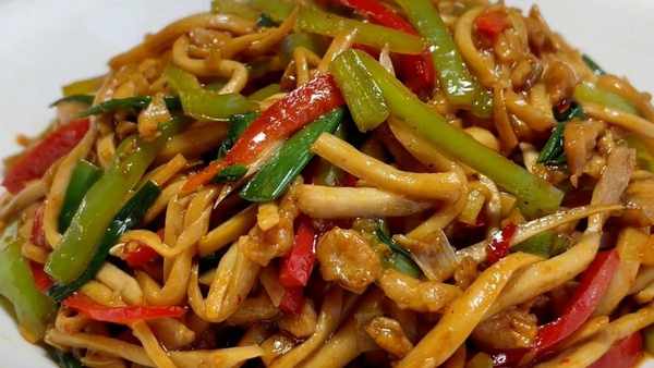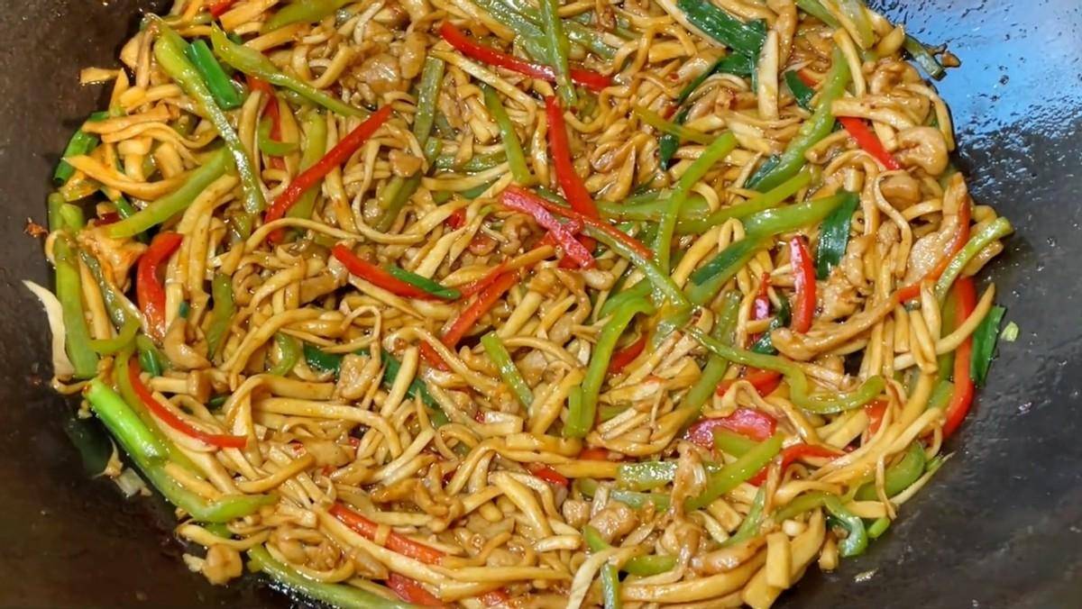 炒至肉丝颜色红亮,倒入杏鲍菇丝,翻炒均匀炒出多余水分,开大一点翻炒,炒至十秒钟左右,倒入青红椒丝,炒出香味,炒至断生。