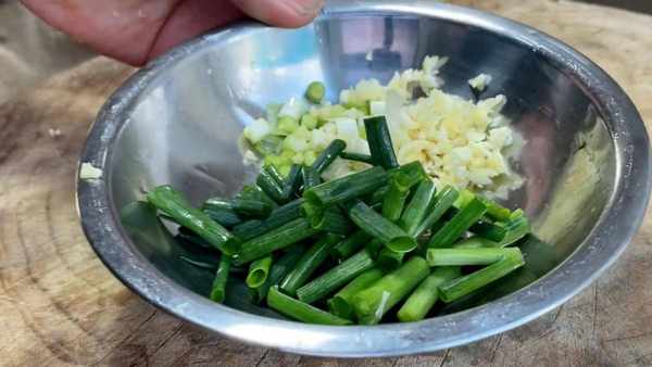 准备小料,生姜,大蒜少许,把大蒜先拍破,生姜剁碎,小葱把葱白部切成粒,和姜蒜放在一起,葱叶切成葱段。