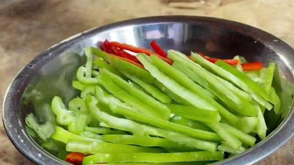 青椒清洗干净,去掉辣椒蒂,再对半切开,去掉辣椒籽,切成细丝,再切一些小米辣,切好后装入盆中。