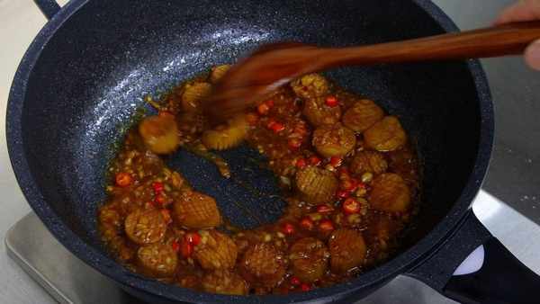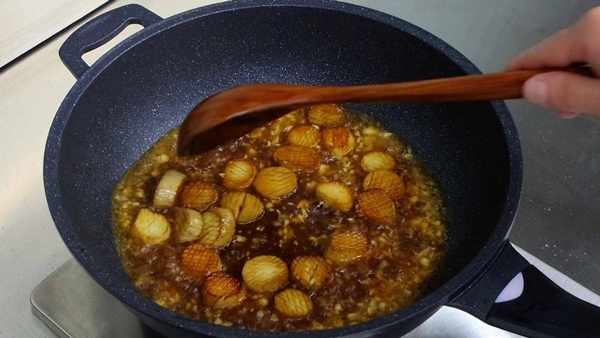 再倒入清水,加入一勺蚝油,一勺蒸鱼豉油,适量蒜蓉辣酱,一勺白糖,少许鸡精,用勺子把调料充分搅拌均匀,把水烧开,水烧开后再把杏鲍菇放进锅里。