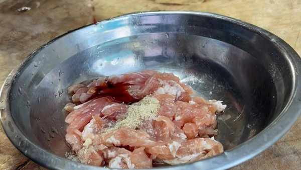 把肉腌制底味,加入一少盐,胡椒粉,料酒,生抽,倒入适量清水,用手抓拌均匀,肉丝表面起粘,放入少许玉米淀粉,抓拌均匀,锁住肉丝水分,最后放入少许植物油,抓拌均匀。