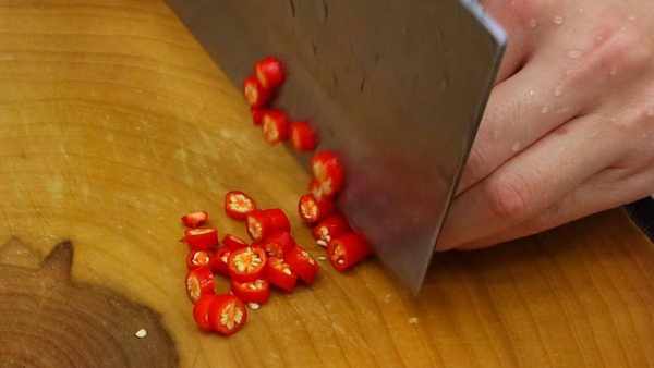 大蒜切成蒜末,小米椒切成圈,小葱切成葱花,全部切好放在碗中。