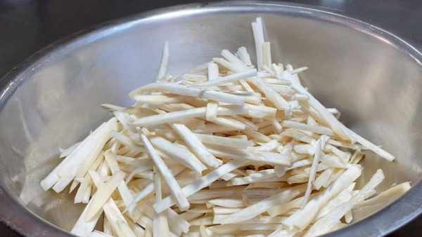 放在案板上,从中间切成两半,切成薄片,再切成细丝,切好装入盆中。
