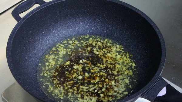 锅里再次放油,油烧热,把蒜末放入锅中,大火煸炒一会,把蒜末颜色炒至发黄,让蒜香味充分释放出来。