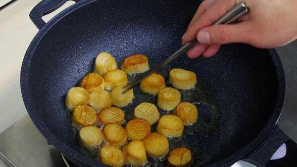 锅里加入食用油,油热放入杏鲍菇,开小火煎一下,不要着急搅动,煎至一面金黄翻面,煎至杏鲍菇表面的颜色煎成焦黄色,盛出放在盘中。