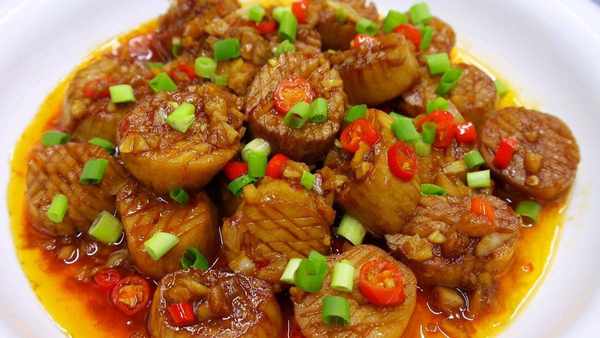 汤汁浓稠,杏鲍菇入味,关火出锅即可,最后撒上小葱装入盘中,一道蒜香杏鲍菇就完成了。