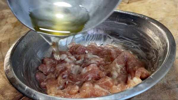 猪肉洗净,切成薄片,剁成细丝,切好装入盆中。