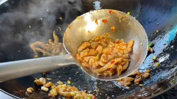 另起锅把锅烧干,烧至锅底发白冒烟,放入植物油,先把锅润透,润透后盛出热油,再放入少许凉油,油热后中火倒入肉丝,用勺子快速推动炒散,肉丝炒制定型表面发白,下入葱,姜,蒜炒出香味,放入香辣酱炒出颜色,炒出香味。