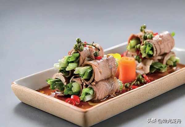 牛腱子肉片摊平,放上泰国香菜段、香芹段、牛腱子丝裹成卷,码入盘中摆好,淋上用蒜泥、小米椒碎、鲜青花椒、美极鲜、藤椒油、葱油、辣鲜露、味粉调匀的味汁,即成。