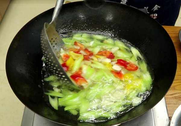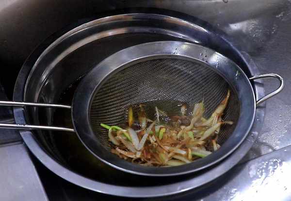 2.把锅烧热,多加一些植物油,油温五成热时,倒入葱丝开小火浸炸,经常搅动把里面的葱油炸出来,葱丝炸干、炸成金黄色时倒出来,用葱油炒出来的菜更香。