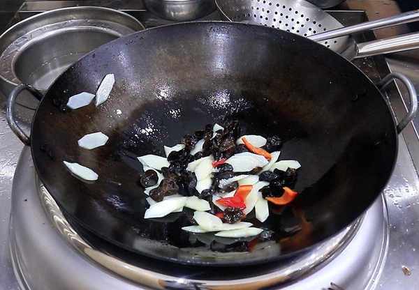 4.再次把锅烧热,加入刚刚炸好的葱油,把木耳、山药和红椒控干水分,油温五成热时,把配菜倒入锅中翻炒均匀,加入食盐2克,味精1克,转大火快速翻炒化开调料。